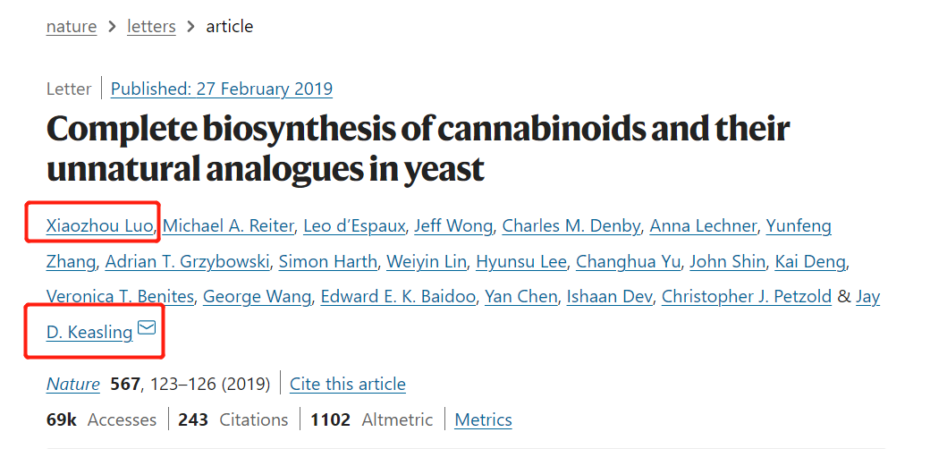 2019 年,罗小舟博士与其导师 Jay D. Keasling 院士合作,成功打通大麻素的生物全合成通路,相关研究成果发表在了学术期刊 Nature 上,成为合成生物研究的一个典型案例。在之后,团队还进一步实现了大麻素的产业化转化。