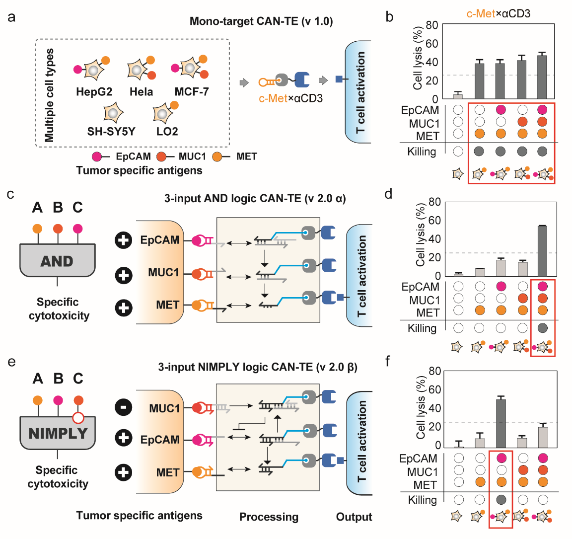 该工作基于HUH-核酸内切酶家族蛋白DCV能够识别特异性序列的单链DNA发生共价交联反应的特性,构建嵌合式DNA-DCV-αCD3融合分子,实现任意DNA纳米结构的可编程式组装。该模块化的CAN-TE平台不仅能够智能化识别肿瘤细胞,同时可顺利获得复杂的可编程逻辑计算能力,精确、定量控制T细胞肿瘤杀伤效能。