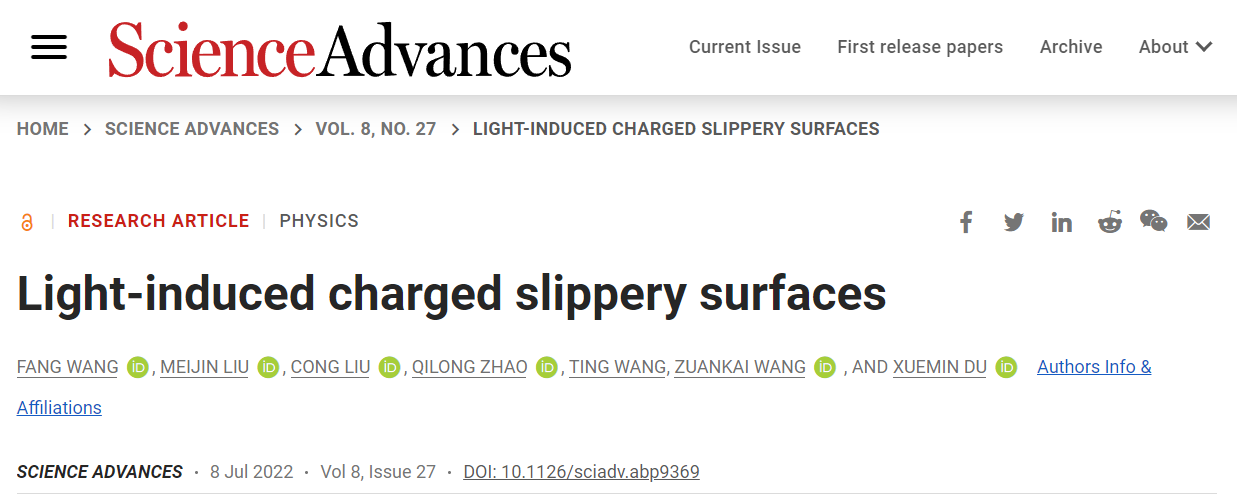 Science Advances | 凯发k8官网研究团队在光诱导带电润滑表面取得重要进展
