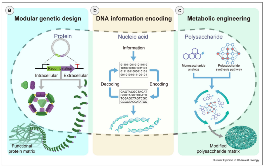 研究团队总结了三大类生命体中的内源性材料模块(蛋白质、核酸和多糖),它们能够被重新设计成新的功能分子,以赋予活体材料新的功能(1)。文章中对每种材料模块的分子设计、修饰手段以及应用方向都给予了详细介绍。比如,蛋白质模块可以顺利获得蛋白质重组的方法整合不同的功能,重组蛋白能够在体内自组装或分泌到胞外形成功能化的蛋白基质纤维;核酸模块多样化的碱基排列方式可以被用于编码和记录信息,这些信息可以在需要时被解码;多糖模块可以顺利获得引入非天然单糖或者改造多糖代谢通路的方式进行修饰,以制备功能改性的多糖网络。