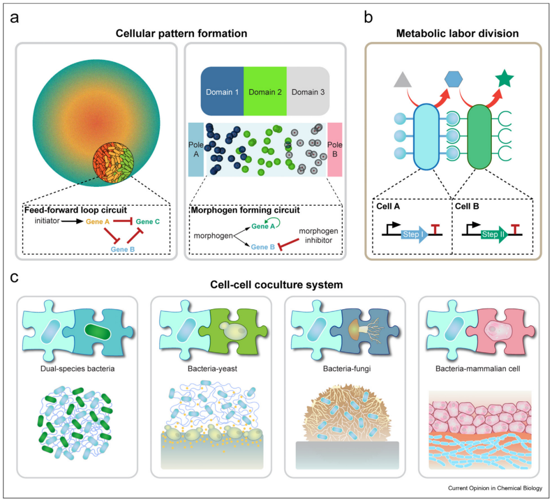 跨种属的多细胞体系更类似于哺乳动物的器官组织,但由于现在对跨种属研讨的理解有限,共培养是最常用的跨种属联盟的构建方式。现在已经实现包括细菌-细菌、细菌-酵母、细菌-真菌和细菌-哺乳动物细胞在内的四种跨种属多细胞体系(3)。通常其中一种底盘细胞负责结构材料的生产,另一种底盘细胞行使特定生物功能。