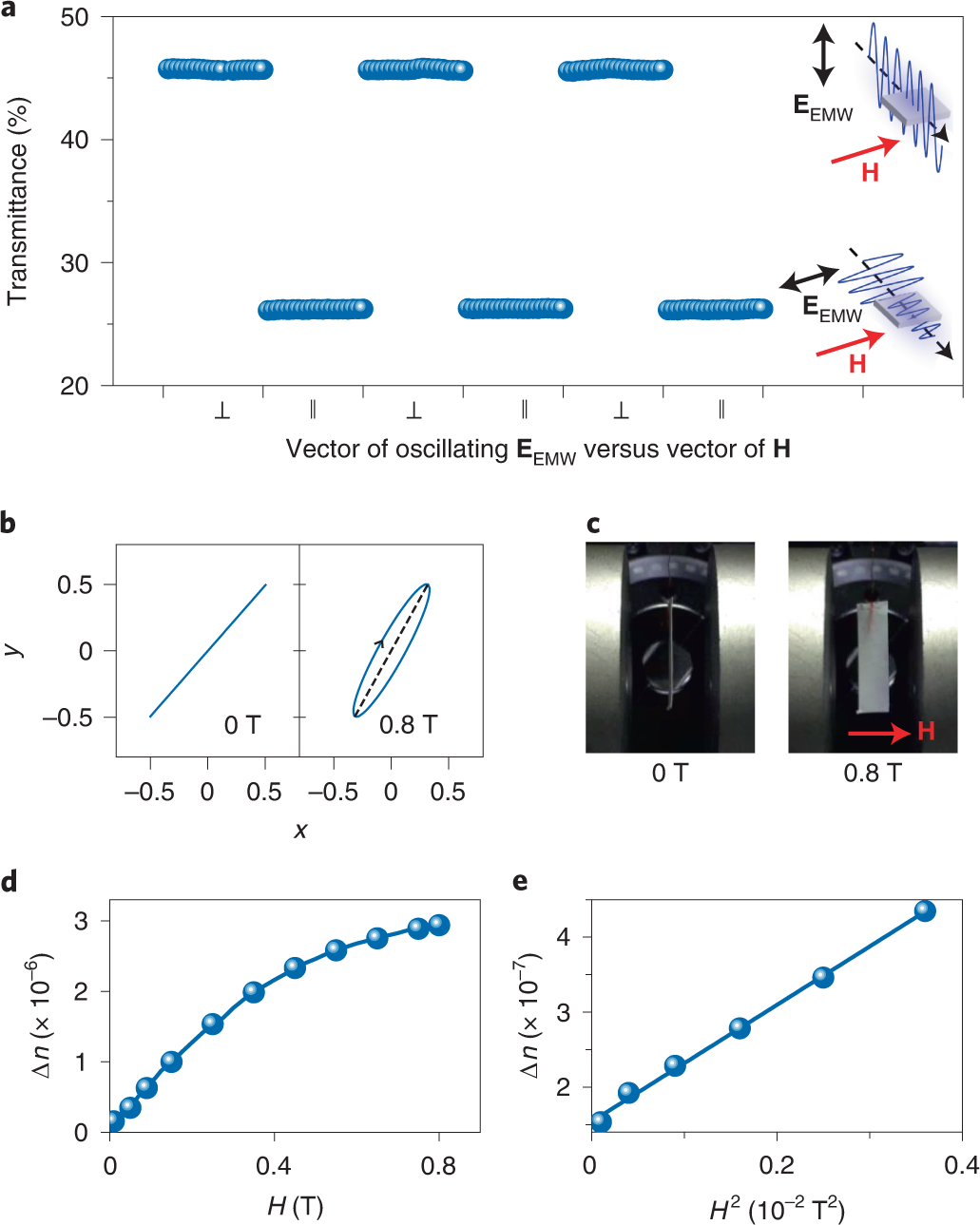 团队成员顺利获得观察入射光偏振态与磁场作用下液晶透射率关系的实验揭示了二维六方氮化硼在外场作用下顺磁场的排布方式。在入射光的偏振被调整为平行垂直于磁场的两种状态下,后者呈现较高的透射率,间接印证了二维六方氮化硼纳米片平行于磁场方向排布针对层状二维六方氮化硼薄膜的磁化率各向异性测试揭示了面内易磁化方向,进一步证实了二维六方氮化硼纳米片顺磁场排布的物理机制。结合二维氮化硼纳米片的极大的光学各向异性,因此发现了二维六方氮化硼液晶磁致双折射效应
