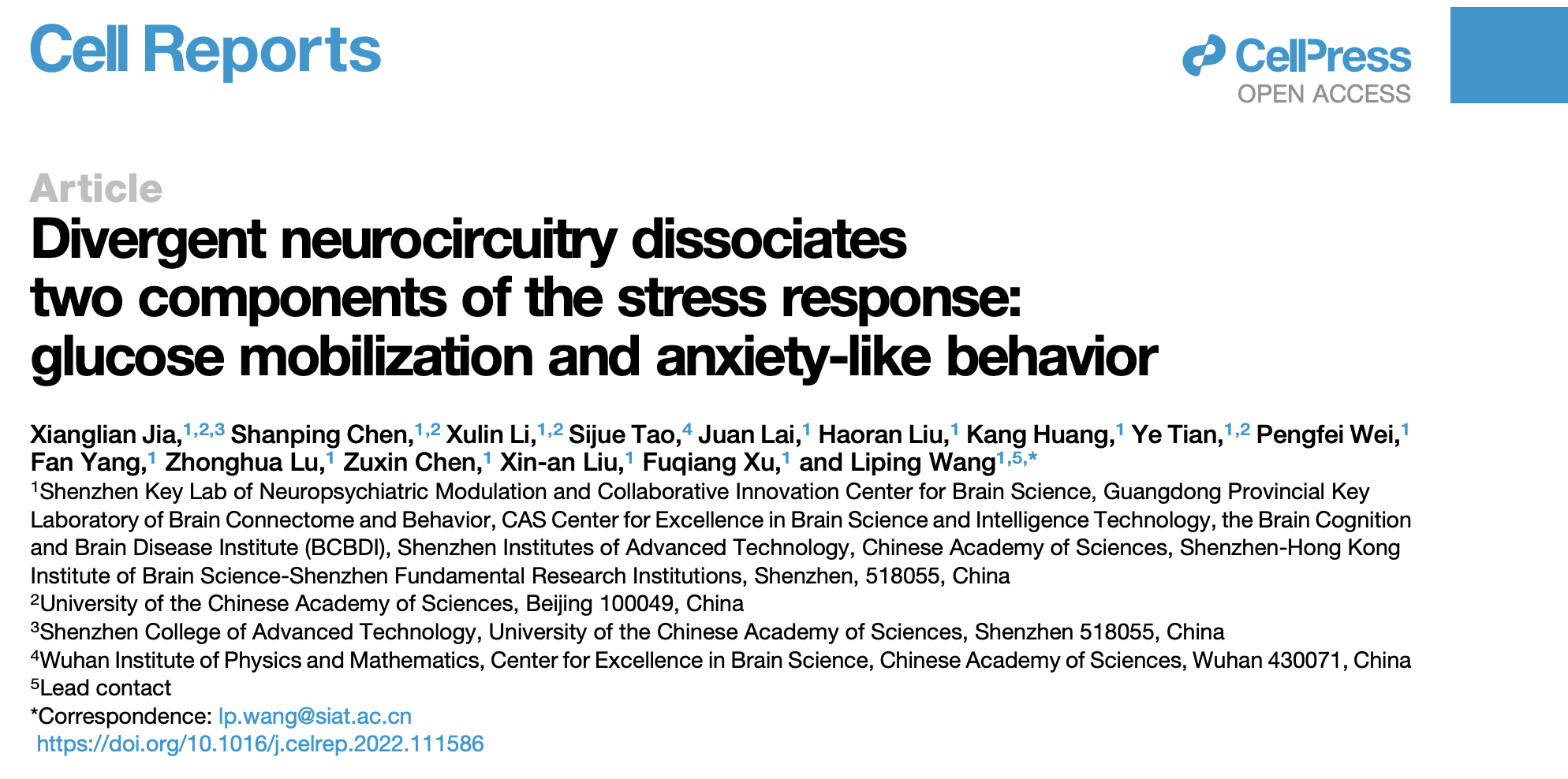 Cell Reports | 中科院凯发k8官网王立平团队发现大脑“平行处理”压力应激导致焦虑行为与血糖升高的神经环路