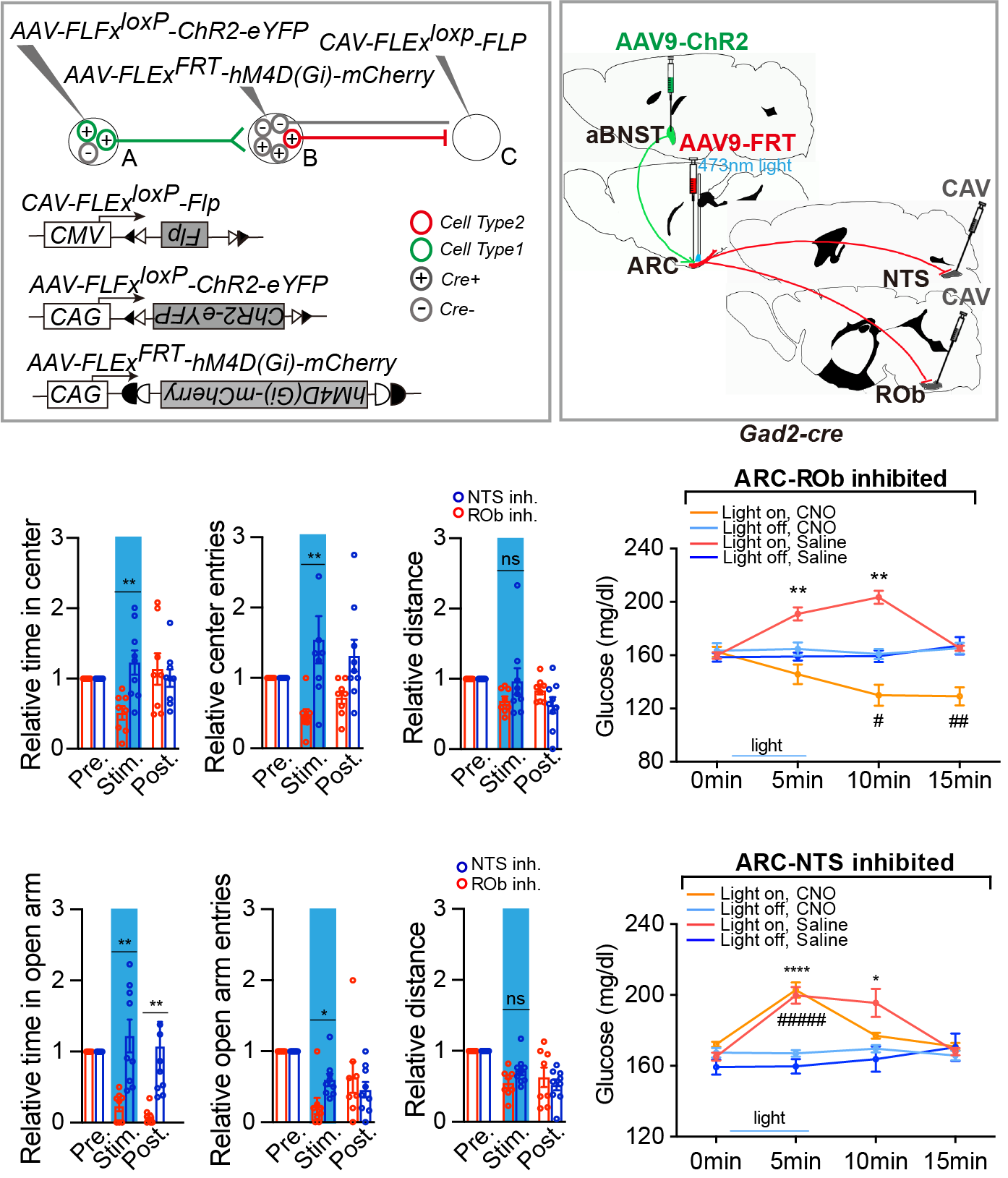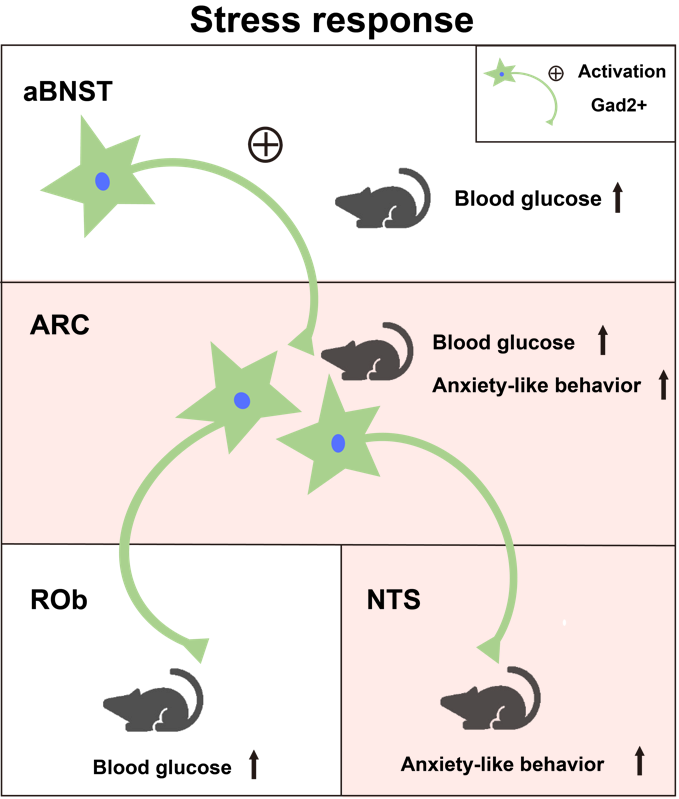 图二 aBNSTGAD2→ARCGAD2→ROb 和 aBNSTGAD2→ARCGAD2→NTS 分别介导压力引起的血糖升高和焦虑样行为产生