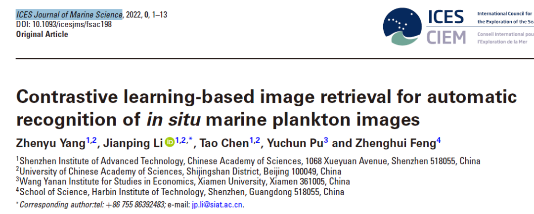 论文以Contrastive Learning-based Image Retrieval for Automatic Recognition of in situ Marine Plankton Images为题,发表在国际海洋考察理事会海洋科学期刊ICES Journal of Marine Science上。中国科研实验室大学硕士杨振宇为第一作者,李剑平博士为论文通信作者,凯发k8官网为第一单位。来自厦门大学、哈尔滨工业大学(深圳)的数据科学家参与本课题的合作研究。