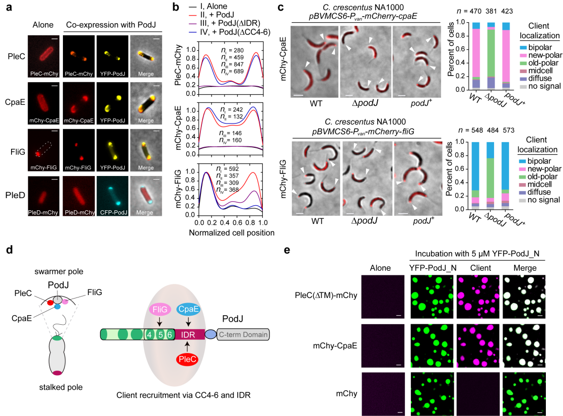 图 3. PodJ细胞区室化的生理功能。a-b. 在大肠杆菌中筛选与PodJ相关的细胞信号蛋白;c.在新月柄杆菌中验证PodJ招募相关的细胞信号蛋白;d. PodJ招募细胞信号蛋白模式图;e. PodJ顺利获得相分离招募细胞信号蛋白。