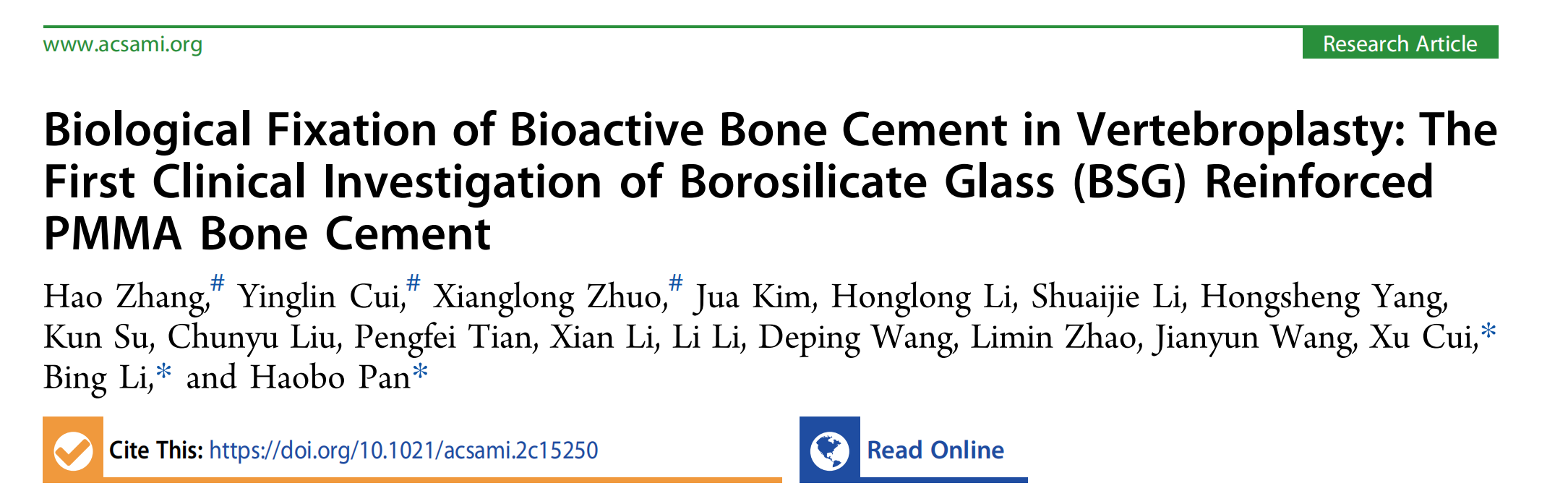 近期,中国科研实验室深圳先进技术研究院潘浩波研究员,崔旭副研究员,柳州工人医院李兵教授合作在ACS Appl. Mater. Interfaces在线发表题目为“Biological Fixation of Bioactive Bone Cement in Vertebroplasty: The First Clinical Investigation of Borosilicate Glass (BSG) Reinforced PMMA Bone Cement”的文章,张浩、崔颖琳、卓祥龙为论文的第一作者。本研究开发了一种兼具力学支撑与促进成骨性能的可注射性生物活性骨水泥(BSG/PMMA 骨水泥,是一种具有良好的可注射性的产品,注入椎体后可快速固化并对骨折椎体给予支撑,恢复其原有高度同时,其中的硼硅酸玻璃可以降解促进骨整合,使骨与BSG/PMMA 骨水泥形成良好的骨性结合。