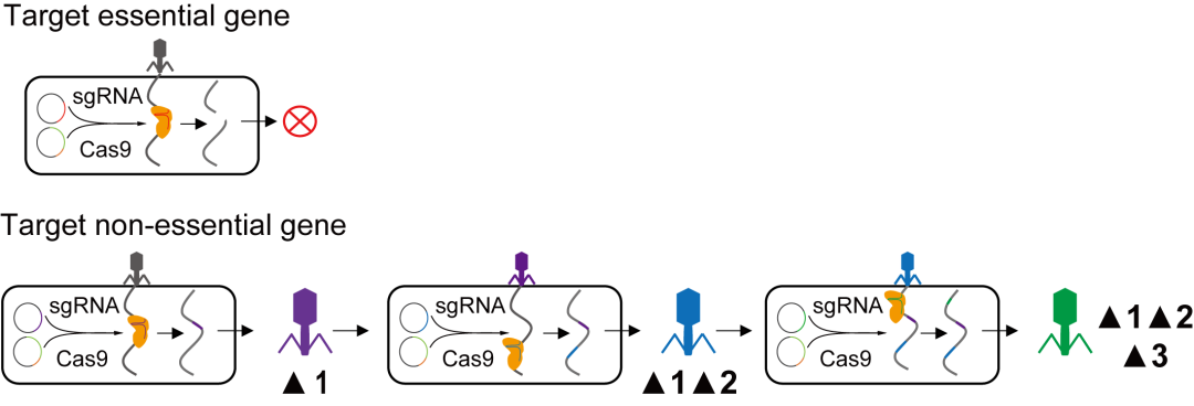 基于这个启发,团队开发了一种自上而下的全基因组简化方法,称为基于CRISPR-Cas9的迭代噬菌体基因组简化方法(CRISPR/Cas9-based iterative phage genome reduction, CiPGr)。针对所有目标基因,设计不同的CRISPR系统,并在DNA芯片上合成,制备出删除噬菌体不同基因的CRISPR细菌文库。在CiPGr过程中,用一群噬菌体侵染细菌文库,使不同的噬菌体删除不同的基因,形成一个噬菌体突变文库。如果被删除的基因对噬菌体扩增不是必需的,则突变噬菌体后代可以继续侵染新的细菌。噬菌体突变文库不断转接到新鲜培养的细菌文库中,使得基因缺失在噬菌体基因组中不断积累,而具有生长优势的基因组简化噬菌体将在种群中占主导地位,最终被富集并更可能被分离纯化出来(图2)。