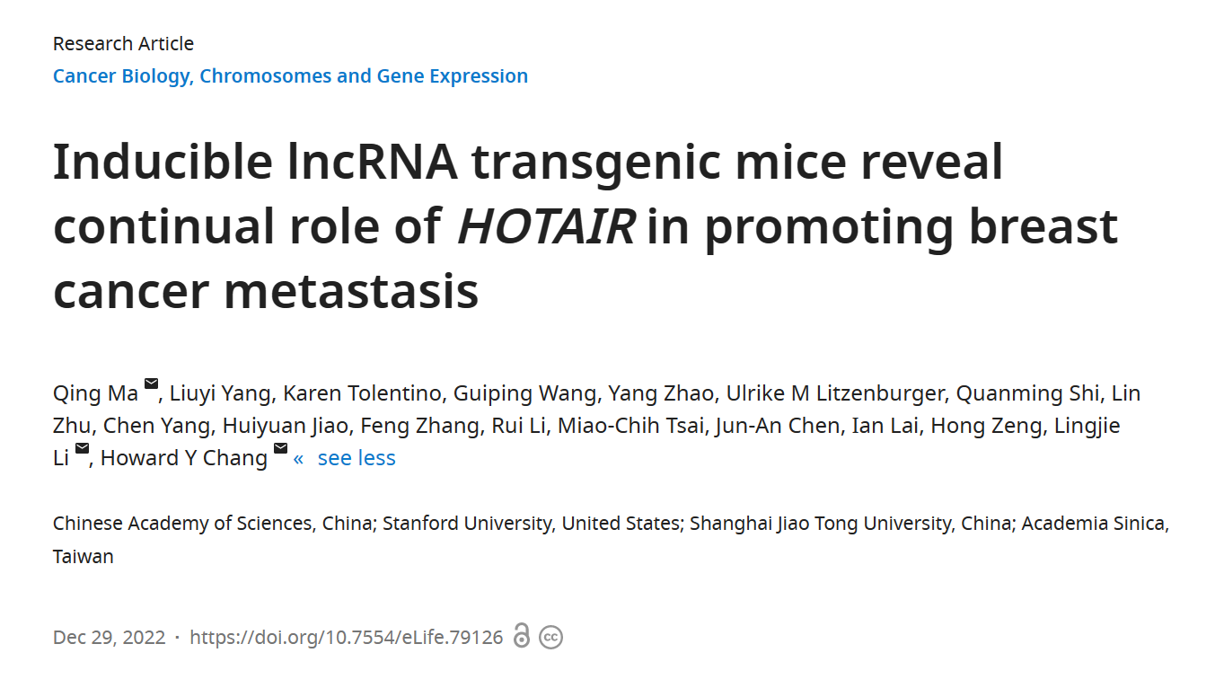 北京时间12月29日,中科院凯发k8官网马晴研究员课题组与斯坦福大学Howard Chang实验室、上海交通大学李令杰课题组合作,在国际学术期刊eLife上发表了题为“Inducible lncRNA transgenic mice reveal continual role of HOTAIR in promoting breast cancer metastasis”的研究论文。该研究首次建立了可诱导过表达人类长非编码RNA HOTAIR的小鼠模型。顺利获得该小鼠模型,该研究展示了HOTAIR过表达能影响肿瘤细胞的染色质开放性程度,从而调控基因表达,并最终促使小鼠乳腺肿瘤向肺部转移。更重要的是,顺利获得撤除诱导剂来取消HOTAIR的过表达水平后,细胞的染色质开放性和基因表达改变都能有所回复,且细胞转移能力也会降至原来的水平,这说明该促使乳腺癌细胞转移的过程需要HOTAIR的持续表达来维持,这意味着HOTAIR可以作为抑制乳腺肿瘤转移的潜在治疗靶点。