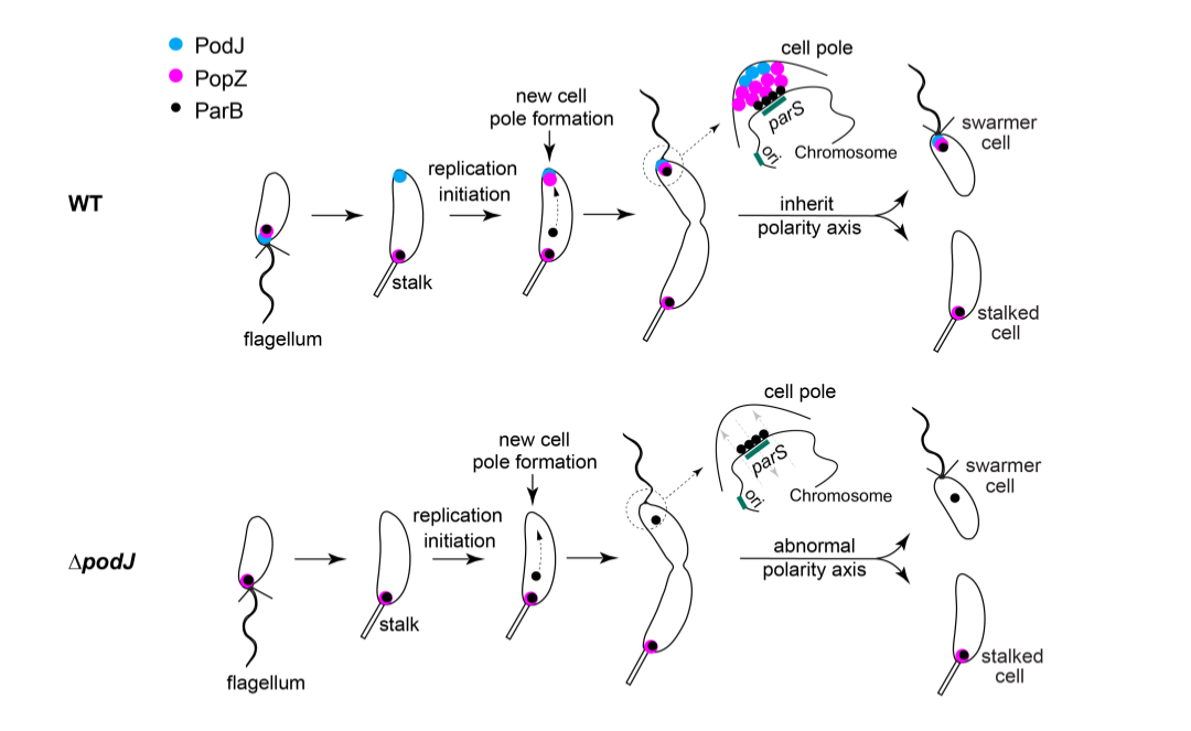 细胞极化的一个关键性事件是在细胞新极形成蛋白复合物,其组成成分和生物学功能不同于细胞旧极。脚手架蛋白PopZ和PodJ都已被证明是新月柄杆菌细胞极性蛋白复合物的组织者。在这里,研究者发现了PopZ和PodJ脚手架蛋白之间直接且保守的相互作用,这是PopZ由单极定位模式转变成双极定位模式的重要驱动力。