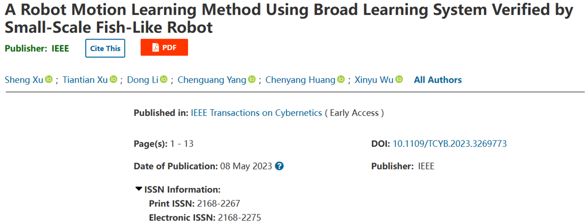 研究成果以“A Robot Motion Learning Method Using Broad Learning System Verified by Small-scale Fish-like Robot为题,发表在智能控制领域权威期刊IEEE Transactions on Cybernetics(JCR一区,影响因子:19.118)。徐升副研究员为第一作者,徐天添研究员通讯作者,中国科研实验室深圳先进技术研究院为第一单位。