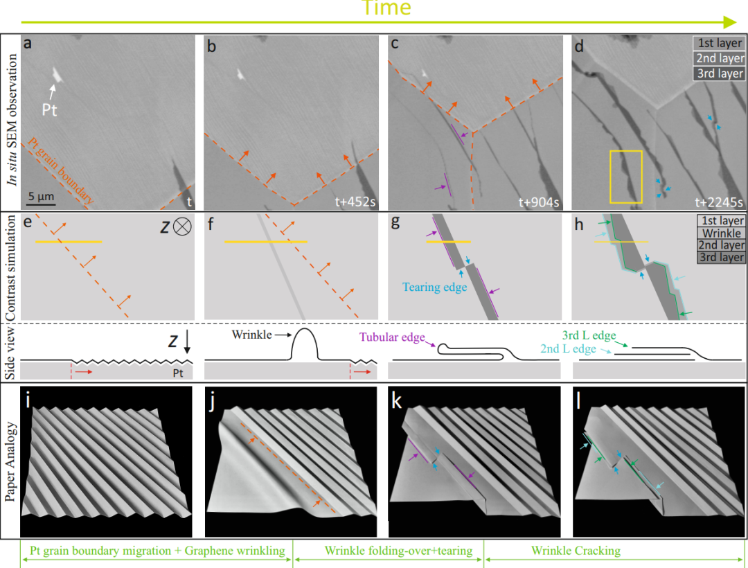 1:石墨烯折纸现象的记录与演示,其中(a-d)原位ESEM实验所记录的褶皱形成、倒下和再生长的过程;(e-h)相应过程的示意图;(i-l)利用折纸模型演示褶皱的形成、倒下和再生长。