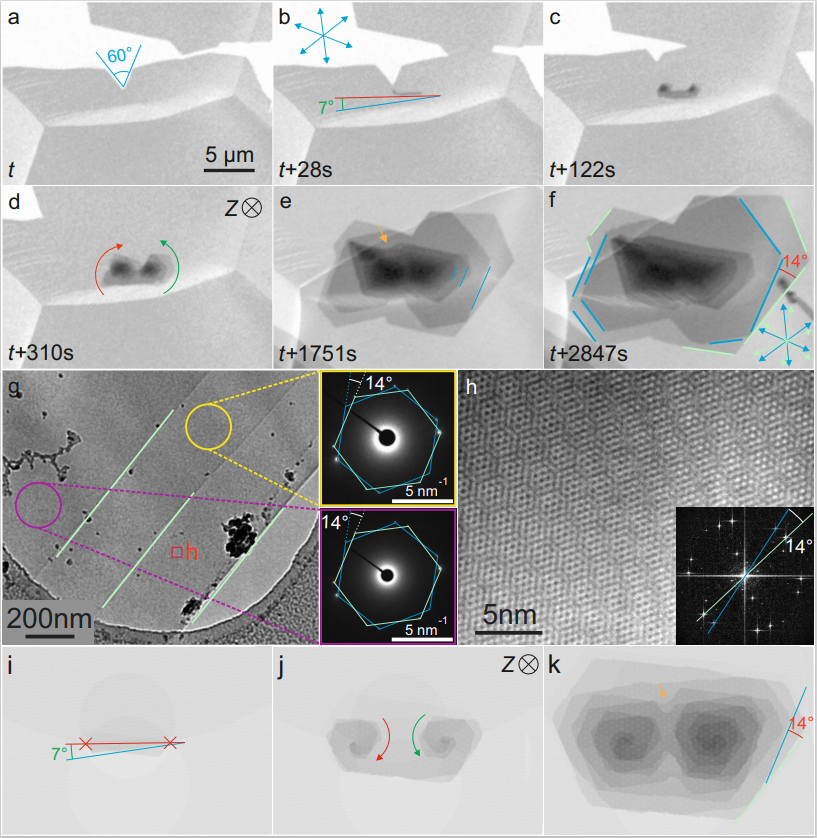 图3:石墨烯螺旋的再生长和合并,其中(a-f)原位ESEM实验所记录的褶皱出现到最终生长成多层转角石墨烯的全过程;(g)TEM表征下的多层转角石墨烯;(h)原子分辨率的多层转角石墨烯表征图;(i-k))动力学蒙特卡洛对该过程的模拟。