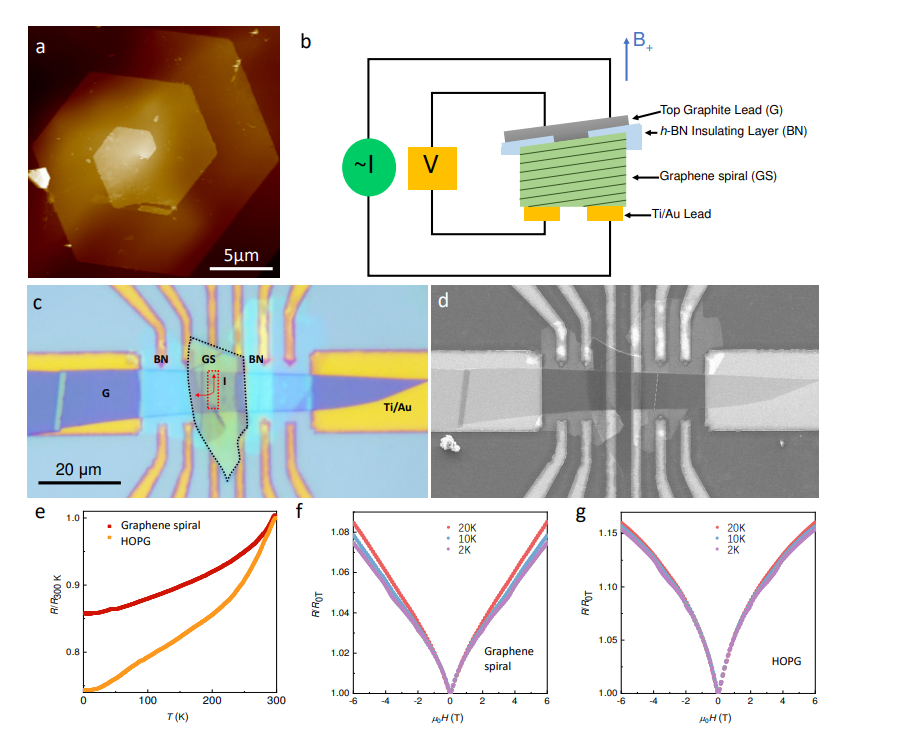 图4:多层螺旋石墨烯和多层堆垛石墨输运性质的区别,(a)原子力显微镜观察到的螺旋位错中心;(b-d)输运性质检测时的实验设置;(e-g)多层螺旋石墨烯和多层堆垛石墨的电阻和磁阻随温度变化的关系。