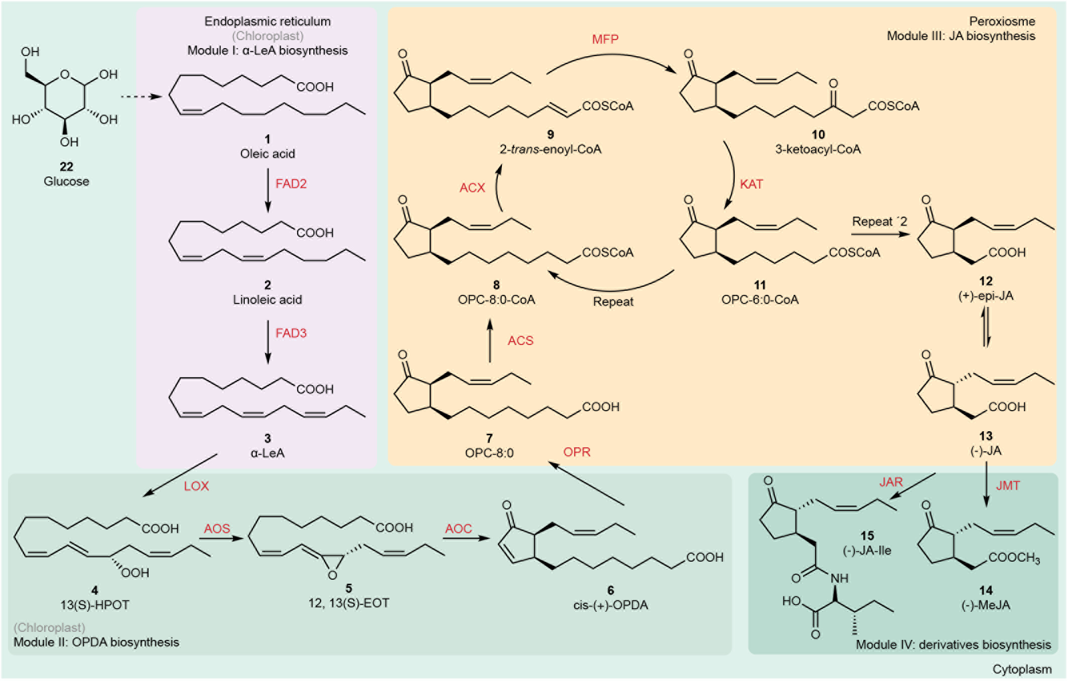 1:茉莉素的生物合成通路。根据产物类型和合成场所的不同,将茉莉素在酵母中的重构途径分为4个模块:模块1在内质网中合成 -LeA;模块2在细胞质中合成OPDA;模块3在过氧化物酶体中合成JA;模块4在细胞质中合成MeJA和JA-Ile。灰色代表相应化合物在植物中的合成场所。
