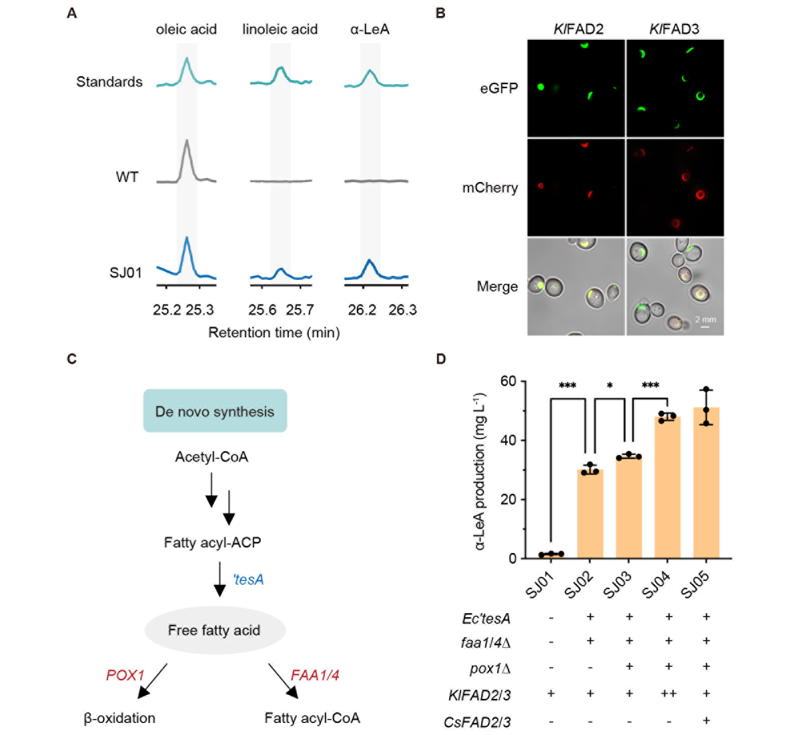 在该研究中,研究团队第一时间在酵母的内质网中合成 -LeA -LeA在植物的叶绿体中被合成,而酵母缺少叶绿体结构;酵母虽不能从头合成 -LeA,却可以在内质网中合成 -LeA的前体。受启发于此,该团队尝试在酵母的内质网中合成 -LeA。顺利获得在酿酒酵母中引入克鲁维酵母来源的FAD,实现 -LeA在酵母的从头合成(2A),但 -LeA的产量仅0.7 mg/L,远不够进行下游转化。共聚焦实验表明,相关基因均成功定位在内质网(图2B)。同时,研究人员还基于改造自由脂肪酸的代谢通路(图2C),将 -LeA的产量提升至51.2 mg/L(图2D)。