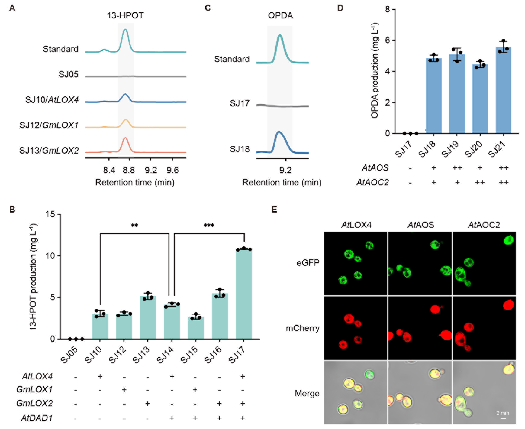 其次,在酵母的细胞质中合成OPDA。OPDA在植物的叶绿体中被合成,同样需要在酵母中寻找适合OPDA合成的场所。细胞质和过氧化物酶体是潜在的候选选项:若在细胞质中合成OPDA,后续需要OPDA转运进过氧化物酶体完成下游转化;若在过氧化物酶体中合成OPDA,则需要底物 -LeA先行转运至过氧化物酶体。考虑到 -LeA在过氧化物酶体中被降解的可能性,该团队尝试将OPDA合成途径(LOX、AOS和AOC)定位至酵母的细胞质中。第一时间对不同来源的LOX进行活性筛选(图3A)和组合表达,将中间体13-HPOT的产量提升至10.8 mg/L(图3B)。继续引入AOS和AOC,成功实现OPDA的生产,产量4.9 mg/L(图3C和3D)。共聚焦实验表明,相关基因均成功定位在酵母的细胞质(图3E)。