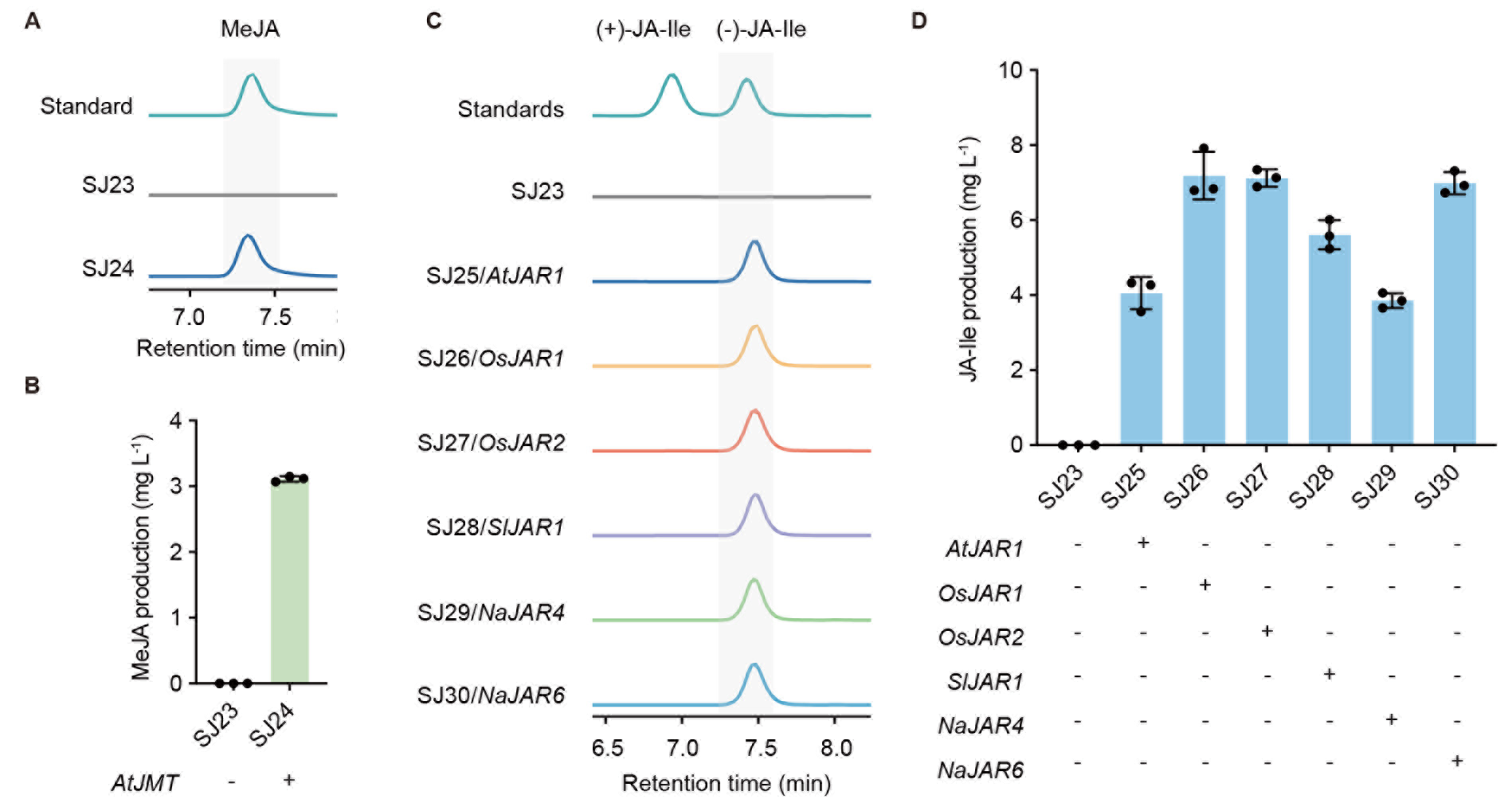 最后,在酵母的细胞质中合成MeJA和JA-Ile等衍生物。在产JA的酵母底盘中引入JMT以合成MeJA,产量3.1 mg/L(图5A和5B);引入JAR合成JA-Ile,产量7.0 mg/L(图5C和5D)。