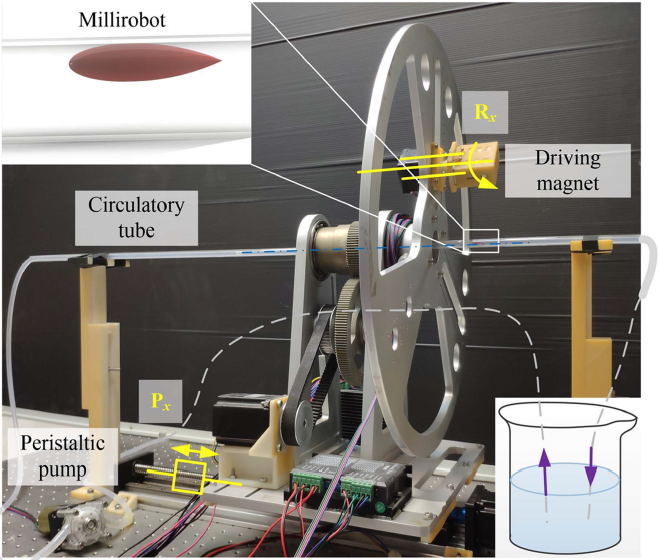 旋转匀强磁场驱动模式受到截止频率限制,无法给予充足的动力实现机器人的高速逆流运动,因而限制了此类磁驱机器人在临床中的进一步应用。建立贴壁旋转磁驱策略,顺利获得旋匀速旋转梯度磁场在流线机器人表面产生的高效磁旋推“拖拽”力克服流体阻力,使机器人在运动过程中受到均匀的动摩擦力,从而可控制无线机器人在管中匀速前进,解决了由于传统梯度磁场驱动机器人时静摩擦力不断变化的扰动,而使机器人运动卡顿、不稳定等问题,达到约143mm/s的相对逆流速度。为探究新方法的临床潜力,研究人员在猪血管中进行了机器人运动能力的测试。顺利获得将一段130mm的猪腹主动脉与蠕动泵连接,模拟了2700mm3/s的血流环境,见图2。机器人成功在26s内顺利获得上述血管,充分验证了机器人在真实血管中的逆流运动能力,使血管内无线机器人的临床应用成为可能。