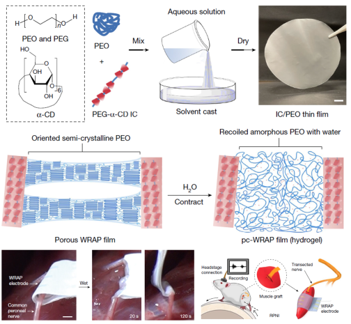 基于这种薄膜构筑的形状自适应电极阵列(WRAP电极)大大简化了植入过程,在润湿后可保形地包裹不同尺寸的神经、肌肉和心脏,并应用于体内神经刺激和电生理信号记录。研究表明,这种新型水响应材料在塑造下一代生物组织电子界面以及拓宽形状自适应材料的生物医学应用方面具有潜在重要作用 。