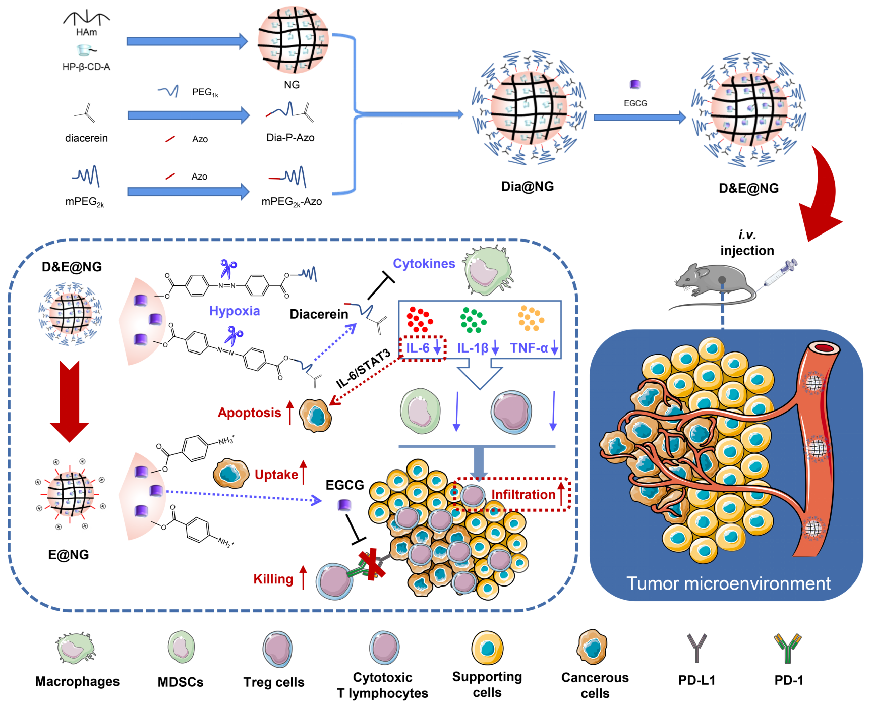 综上所述,该研究团队成功构建了一种缺氧响应型纳米凝胶(NG),用于小分子药物DiacereinEGCG在肿瘤中的递送和渗透(图1)。静脉给药后,载体进入肿瘤微环境(TME)时,第一时间释放Diacerein,顺利获得控制肿瘤炎症环境,有效抑制MDSCsTregs的肿瘤浸润,同时顺利获得抑制IL-6/STAT3信号通路诱导肿瘤细胞的凋亡,实现强效抗肿瘤作用。装载于NG空腔内的EGCG在被肿瘤细胞摄取后,能有效抑制PD-L1的表达,恢复CTLs的肿瘤杀伤能力。联合TIM-3检查点阻断治疗后,肿瘤部位的CTLs浸润增加,全身免疫被有效激活,产生强烈的抗肿瘤免疫反应。这项研究为未来顺利获得控制肿瘤炎症环境实现有效的抗肿瘤免疫治疗给予了宝贵的见解。