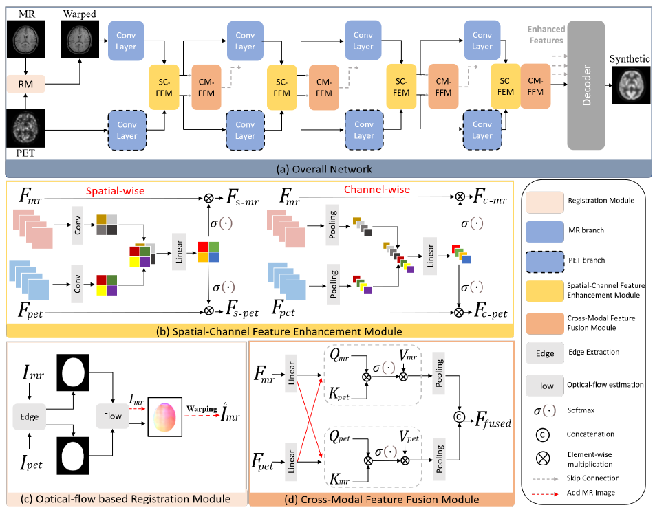 1 提出的基于光流配准的PET/MR成像技术,(a)提出的OIF-Net整体结构,包含的两个分支分别处理PET/MR两种模态输入和特征融合,(b)空间-通道特征增强模块,(c)光流配准模块,(d)跨模态特征融合模块