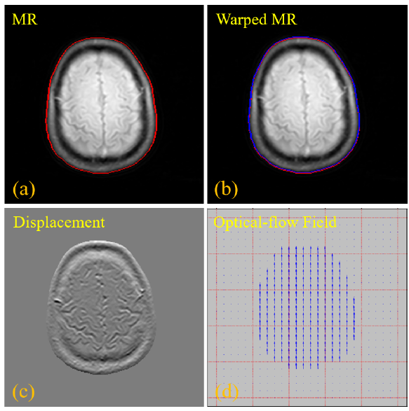 2 基于光流配准的轮廓学习技术,(a)原始输入的MR 图像,红色曲线代表 MR图像的轮廓,(b)配准模块校正后的 MR 图像,蓝色曲线表示配准MR图像的轮廓,(c)配置变换前后的MR图像之间的像素强度差异,(d)稀疏光流场,显示配准预测网络的水平和垂直方向偏移量