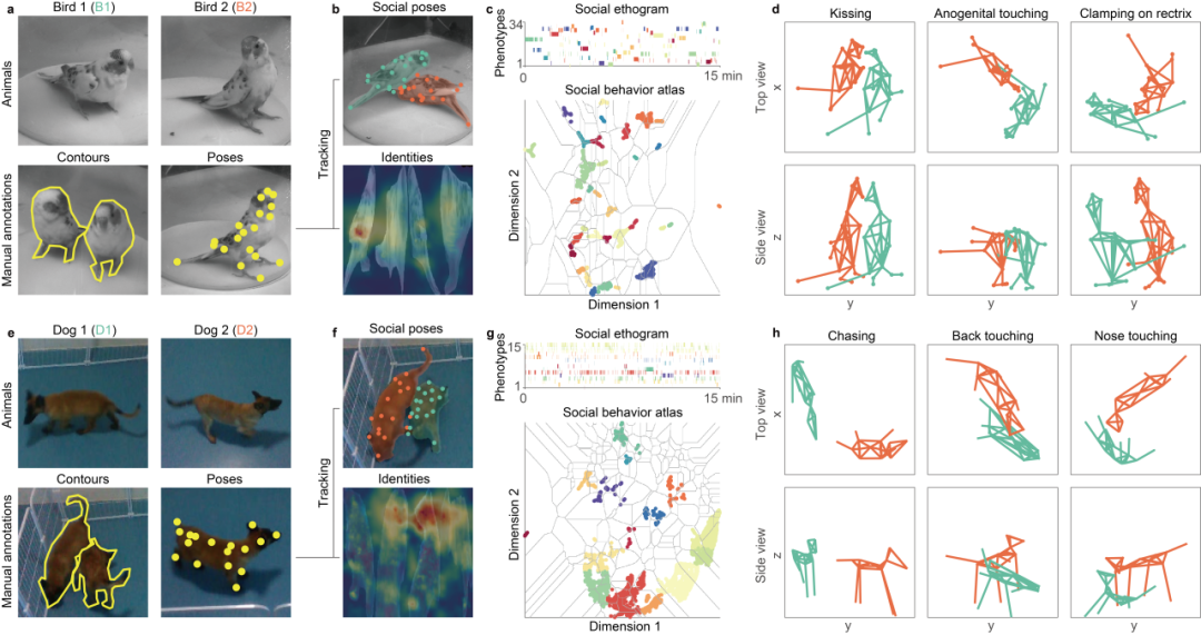除了小鼠外,SBeA也适用于计算鸟类和家犬的精准的3D社交姿态、身份和精细社交模块,具有跨物种应用的潜力(图5)。家犬部分的工作与中国科研实验室昆明动物研究所张亚平院士和王国栋研究员团队、公安部昆明警犬基地李静团队合作,在科技创新2030“脑科学与类脑研究”重大项目支持下共同完成。