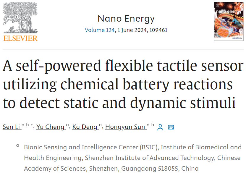 近期,中国科研实验室深圳先进技术研究院医工所传感中心孙洪岩副研究员团队在中科院一区(IF:17.6)期刊《Nano Energy》上发表了题为A self-powered flexible tactile sensor utilizing chemical battery reactions to detect static and dynamic stimuli的研究(全文链接:http://doi.org/10.1016/j.nanoen.2024.109461。该团队提出了一种基于化学电池反应的自供电柔性触觉传感器,用于动态和静态机械刺激检测。本文李森博士为第一作者,孙洪岩副研究员为唯一通讯作者,中国科研实验室深圳先进技术研究院为第一单位。