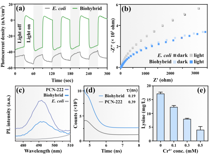 在明确了光驱动赖氨酸生产的最佳条件后,作者重点阐明了该杂合体中的材料-微生物界面的电子转移机制。顺利获得对纯菌和杂合体的光电化学特性进行测试发现,杂合体具有高效捕光且将电子转移至生物体内的能力。为了进一步证实PCN-222能有效地将捕获的光能转移到大肠杆菌中,作者采用光致发光光谱技术(PL)研究了材料-微生物界面上的电子转移。在大肠杆菌细胞内未检测到明显的荧光信号,而杂合体的PL强度明显低于PCN-222。这一结果表明,在杂合体中PCN-222作为电子供体,而大肠杆菌作为电子受体,有效地降低了PCN-222的电子-空穴重组率。随后利用时间分辨光致发光光谱(TRPL)动态地揭示了光反应过程中的界面电子转移。发现杂合体荧光寿命较PCN-222有所缩短,表明PCN-222产生的光生电子可以快速转移至大肠杆菌,与PL的测试结果一致。