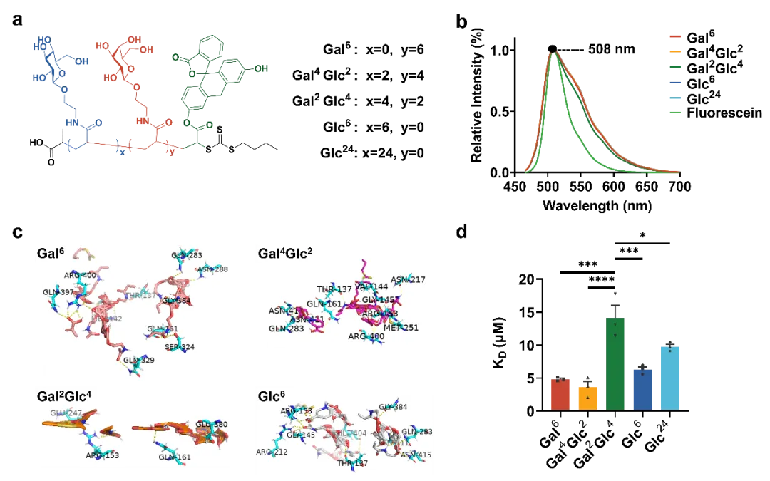 鉴于糖转运蛋白对采用吡喃糖环椅构型的戊糖和己糖的D-立体异构体(如D-葡萄糖、D-半乳糖)具有很强的特异性,研究团队选择以D-葡萄糖和D-半乳糖为基础制备了带丙烯酰胺的糖单体,并进一步顺利获得可逆加成断裂链转移(RAFT)聚合制备了五种含糖寡聚物。五种寡聚物随后被作为候选的葡萄糖转运蛋白Glut1配体进行了体外实验,包括用Glut1蛋白和五种糖链进行分子对接与计算模拟、结合亲和力测试,并顺利获得细胞实验筛选出细胞摄取量高的配体来合成溶酶体靶向嵌合体分子。