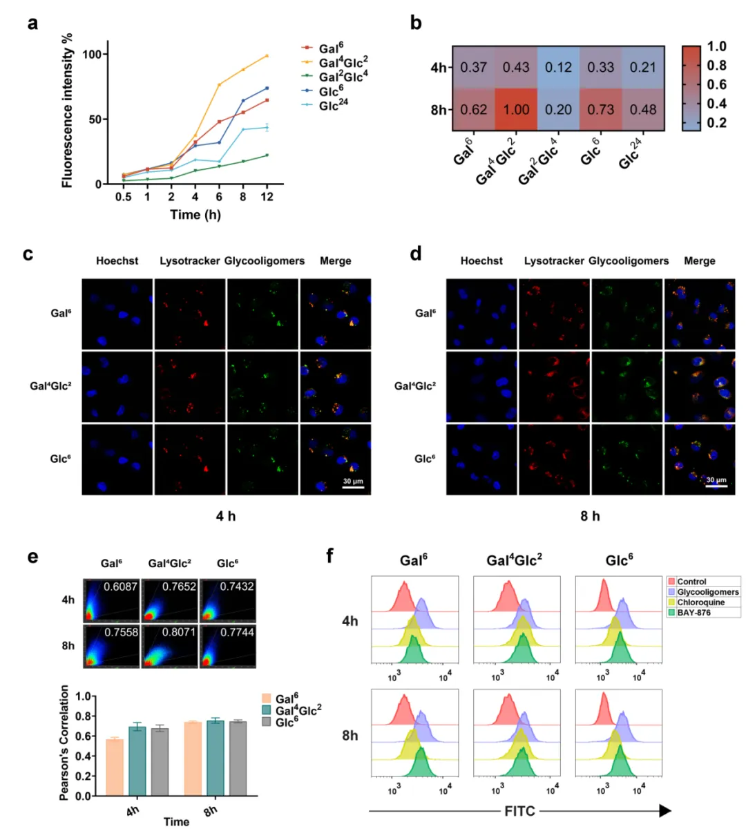 鉴于这一结果推测这三种糖寡聚物的内化途径与溶酶体相关,因此团队进一步顺利获得细胞流式实验探究配体的摄取途径,证明了糖寡聚物在细胞中的摄取是顺利获得溶酶体途径且与Glut1相关。综合上述细胞实验结果,研究团队筛选出了有潜力的Glut1配体Gal6,Gal4Glc2和Glc6进行下一步的溶酶体靶向嵌合体分子合成。