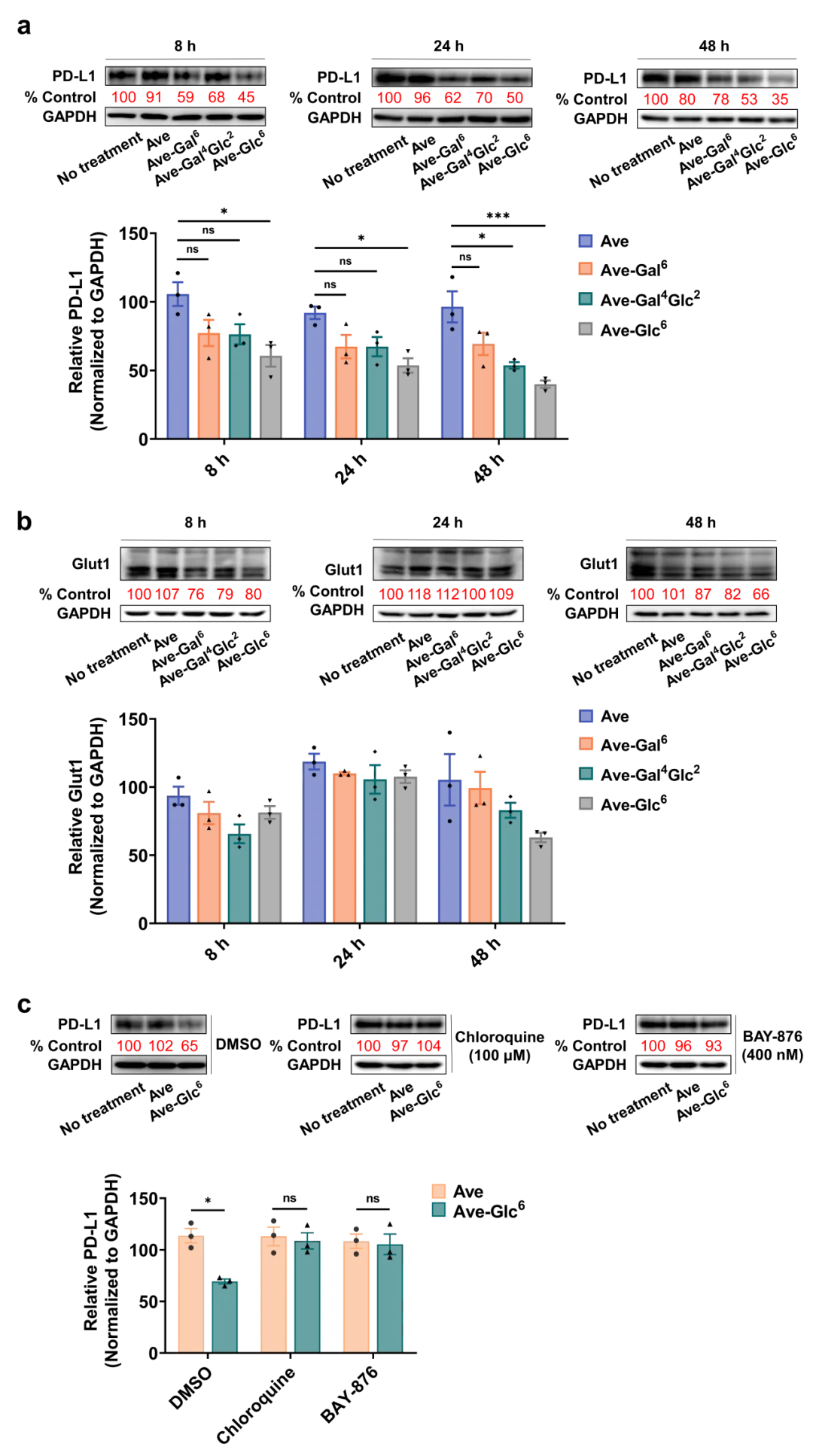 团队进一步探讨了Ave-糖缀合物降解 PD-L1蛋白的降解机制是否与糖寡聚物内化进入细胞的途径相关,免疫印迹实验结果显示Ave-糖寡聚物共轭物分子降解PD-L1蛋白是顺利获得溶酶体途径介导,并且揭示了Glut1在此策略中扮演了重要角色,相信葡萄糖转运蛋白Glut1将在未来的靶向蛋白降解技术中得到更广泛的应用。