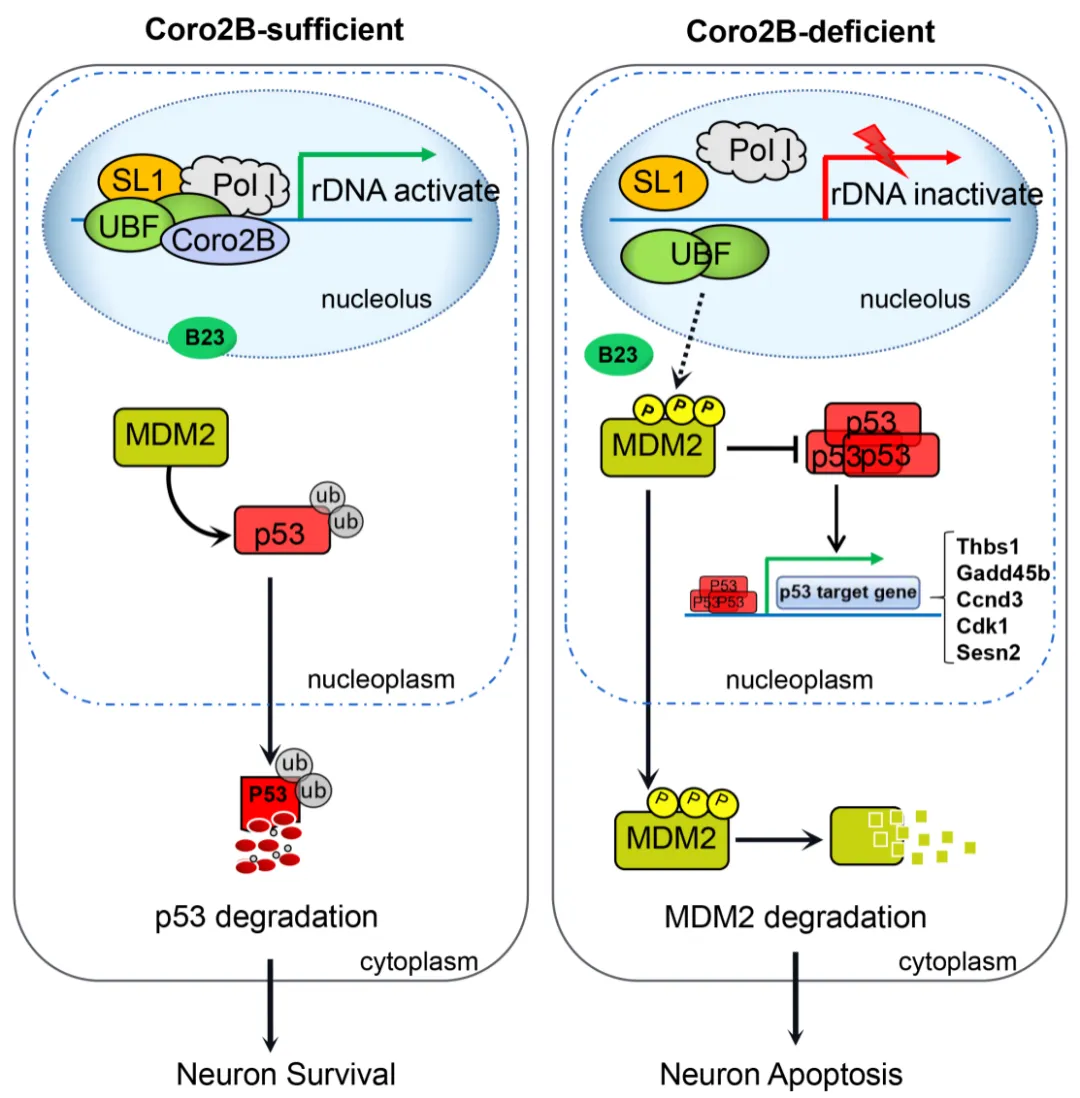 最后,研究人员发现,coronin 2B缺失引发的核仁应激反应,会抑制p53蛋白的降解,从而导致细胞核内p53的过过度积累与激活,启动细胞凋亡程序,引发神经元的死亡(图3)。