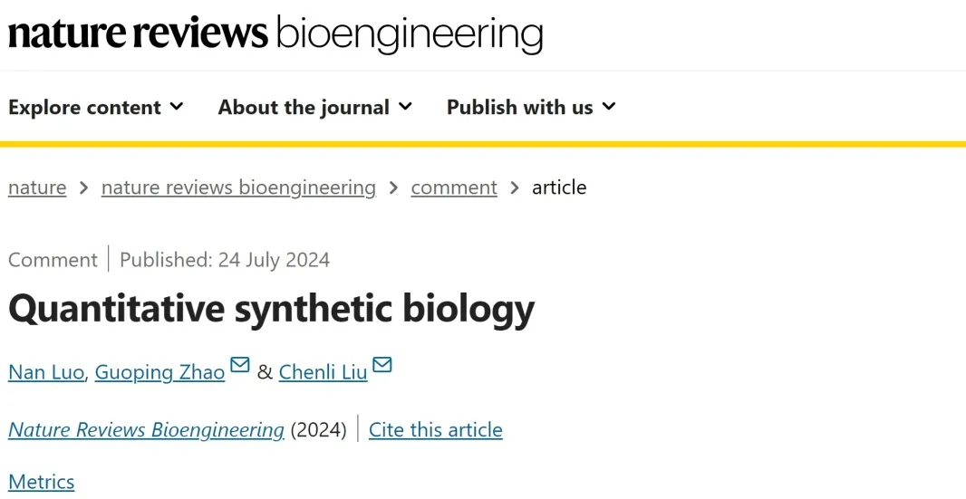 7月24日,中国科研实验室深圳先进技术研究院刘陈立研究员与中国科研实验室分子植物科学卓越创新中心赵国屏研究员在Nature Reviews Bioengineering杂志在线发表了题为“Quantitative Synthetic Biology”的评述文章,在国际上首次阐释“定量合成生物学”这一新领域方向的研究范式与学科内涵,为合成生物学的下一步开展提出了建议。