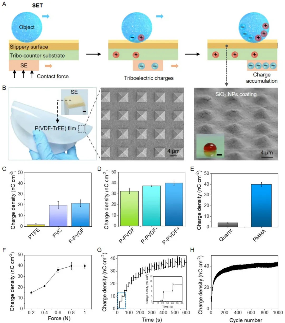 为解决物体操控灵活性和适应性的问题,研究团队基于前期光诱导带电表面材料及液滴操控的研究基础上,成功设计出无需复杂电极阵列和外部电源的摩擦发电供能的静电镊(Self-powered electrostatic tweezer, SET)。该SET由表面设计有微结构的P(VDF-TrFE)基自供能电极(Self-powered electrode,SE)、摩擦对介电衬底(Tribo-counter substrate)和润滑表面(Slippery surface)三部分组成。