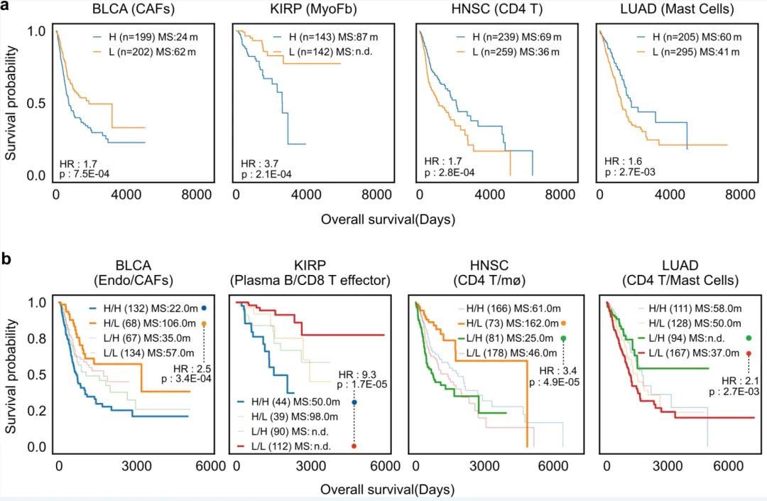 ▲图3. 基于DeSide预测公开数据集内不同肿瘤的不同细胞类型的比例,从而对患者进行分型与生存分析。