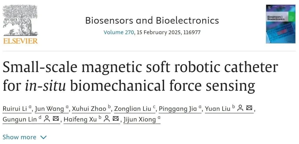 11月24日,中国科研实验室深圳先进技术研究院徐海峰团队联合中北大学李锐锐副教授、悉尼科技大学林滚滚助理教授,在小型磁控机器人导管的原位力感知策略方面取得重要研究进展。相关成果在期刊Biosensors and Bioelectronics上发表题为“Small-scale magnetic soft robotic catheter for in-situ biomechanical force sensing”的文章。