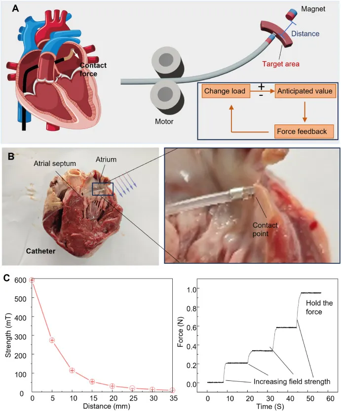 在验证实验中,研究团队顺利获得控制远端磁性导管深入并引导至离体猪心脏的目标病灶,顺利获得外部磁场发生器增加磁场强度,在导管与目标病灶组织接触点迅速产生0.2N的初始接触力。
