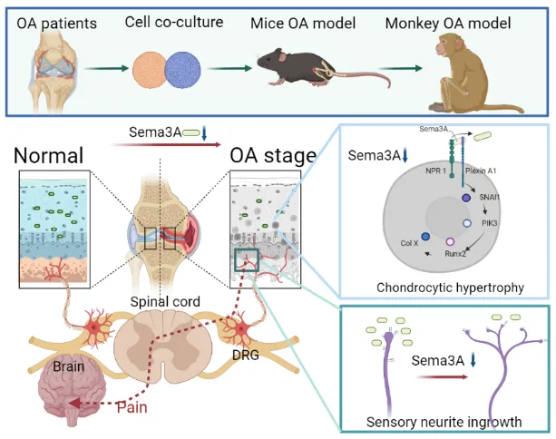 2025年1月2日,中国科研实验室深圳先进技术研究院脑认知与脑疾病研究所杨帆研究员团队、生物医药与技术研究所陈棣教授团队联合四川大学华西医院周宗科主任团队在这一领域取得重要突破,相关研究“Neuronal guidance factor Sema3A inhibits neurite ingrowth and prevents chondrocyte hypertrophy in the degeneration of knee cartilage in mice,monkeys and humans”发表在Bone Research杂志。