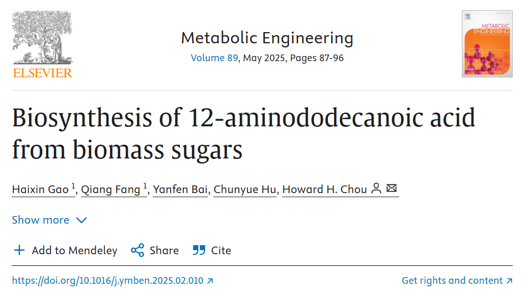 近期,由中国科研实验室深圳先进技术研究院合成生物学研究所合成生物化学研究中心的Howard H. Chou课题组在Metabolic Engineering期刊上发表了题为“Biosynthesis of 12-aminododecanoic acid from biomass sugars”的重要研究成果。