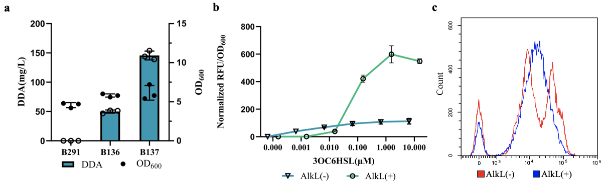 图 1.优化了QSE系统来精细控制DDA的合成。(a)OD600和DDA产量由组成型启动子或基于QSE系统表达UcfatB。(b)基于QSE系统在不同诱导剂浓度下的表达强度。(c)对携带基于QSE系统并表达mCherry的细胞进行流式细胞术分析。
