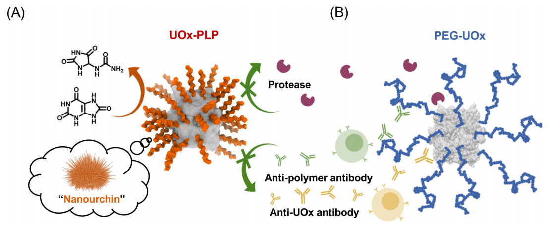 研究团队顺利获得独创的“原位接枝聚合”技术,将刚性聚脯氨酸(PLP)以高密度原位修饰于尿酸酶表面,形成具有纳米级“海胆”结构的尿酸氧化酶-聚脯氨酸偶联物(UOx-PLP)。其核心突破包括: