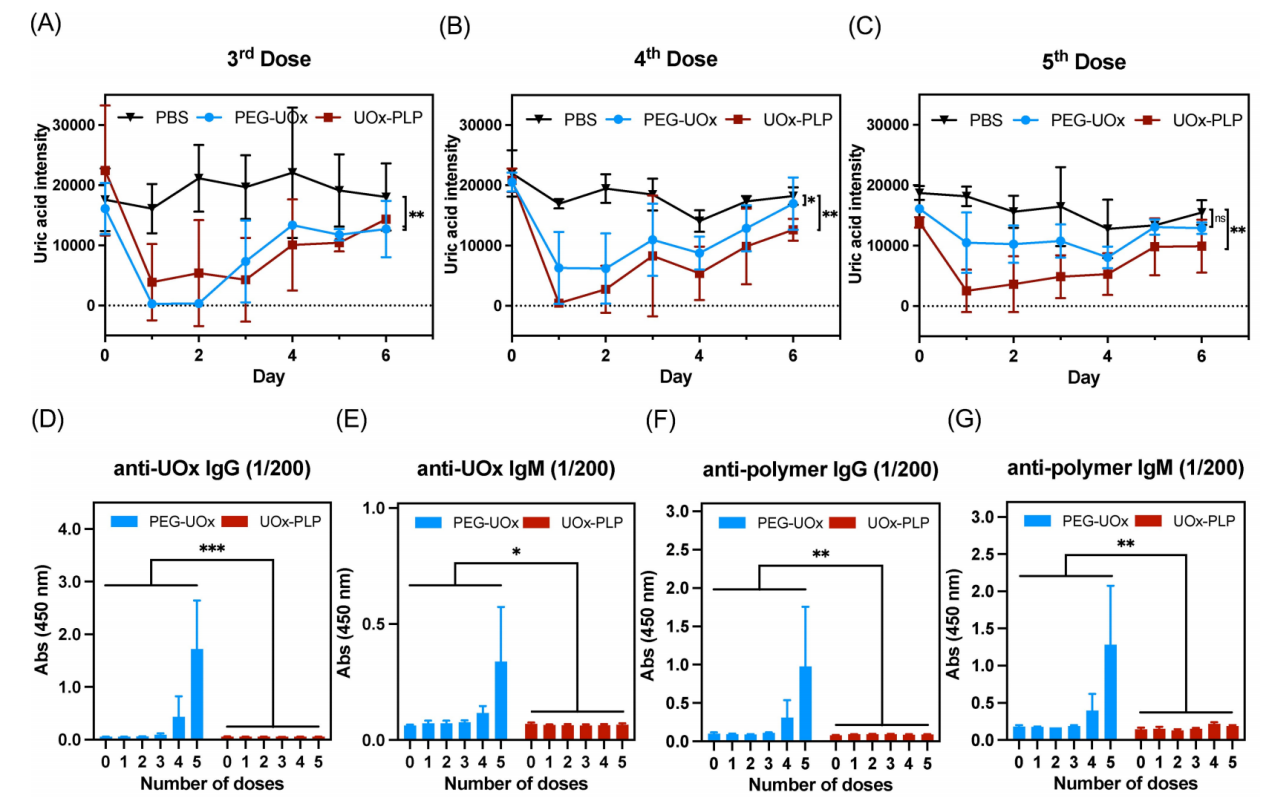 针对高尿酸血症与痛风这一严峻的临床现状,研究团队构建了拟人化高尿酸血症小鼠动物模型进行了五次陆续在尿酸酶给药实验。实验结果显示,UOx-PLP组小鼠的血尿酸水平在给药后显著降低,并且五次给药后疗效无明显衰减,血尿酸水平仍低于治疗阈值;此外,UOx-PLP在小鼠体内的药代动力学特征稳定,半衰期较长,能够持续发挥降低尿酸的作用。相比之下,PEG-UOx组药物在第三次后即出现明显的疗效下降,且疗效下降与其血液中抗药抗体增加在时间上高度一致。这一实验结果不仅证明了UOx-PLP在治疗高尿酸血症方面的优越性,还为该新型蛋白修饰方法的临床应用给予了有力的支持。