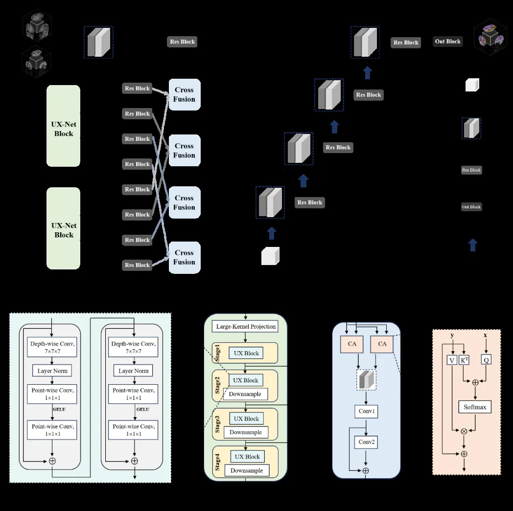 研究团队提出了一种基于交叉融合机制的全脑区自动分割方法,顺利获得融合功能和结构信息以提高脑区分割的准确性。该网络同时处理PET和MR图像,在编码部分,第一时间采用UX-Net进行特征提取,然后利用基于交叉注意力机制的融合模块进行结构和功能特征融合,以增强分割网络对多模态信息的适应性,提高分割效果。
