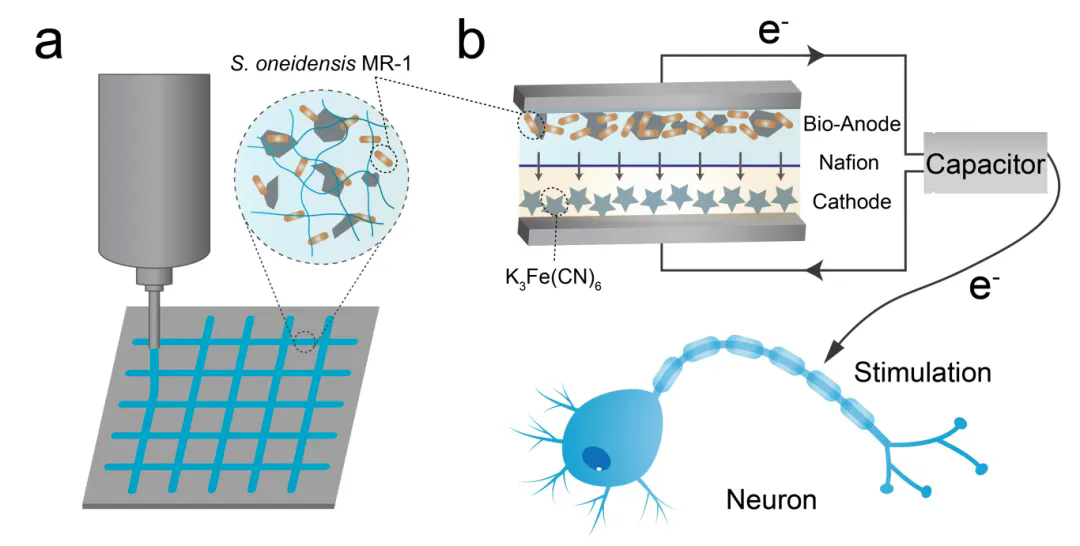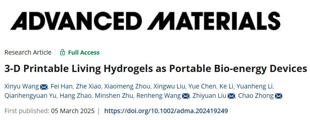 Advanced Materials 封面文章 | 开发3D打印活体水凝胶微型便携式生物电池用于精准神经刺激