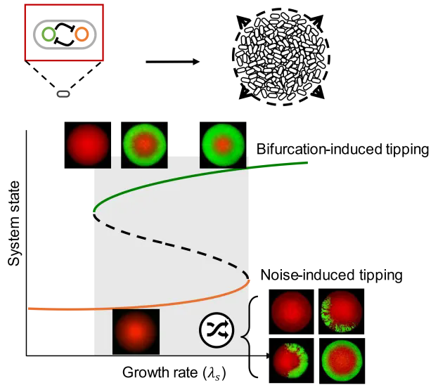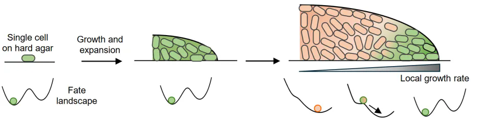 图2 | 环状斑图形成机制示意图:从单个细胞开始,细菌生长分裂形成密集的菌落。在定植后的初期阶段,细胞呈指数增长,同时系统保持双稳态。随着菌落的扩展,微环境中的空间异质性逐渐显现,导致细胞生长速率的变化驱动了确定性的状态转换。这种空间异质性及其引发的状态转换,最终在菌落内部形成了独特的环状斑图模式。