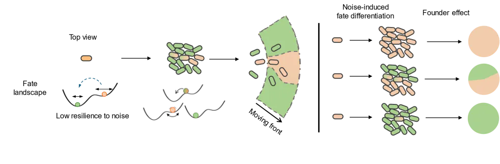 除了确定性的细胞命运分化,研究团队还发现,基因表达的随机性在菌落模式的形成中也起到了关键作用。在菌落扩展的早期阶段,细胞状态的随机切换会被“奠基者效应”放大,导致菌落外围出现红绿相嵌合的扇区状斑图。这种噪声诱导的对称性破缺现象,揭示了细菌菌落在均匀生长环境中如何顺利获得自组织行为产生复杂的空间模式。(图3)