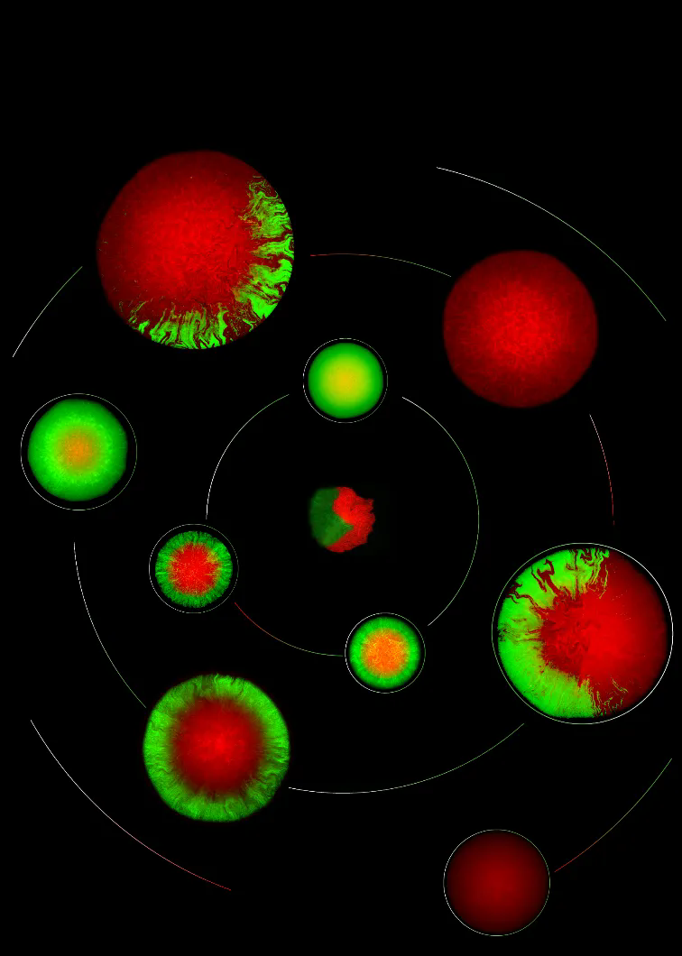 研究团队基于一个常见的实验体系——大肠杆菌菌落在琼脂平板上的生长,发现即使仅依赖一个简单的合成基因开关[1, 2],单克隆菌落也能演化出复杂的空间模式。