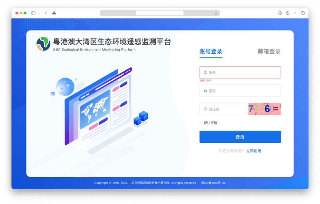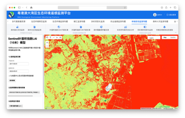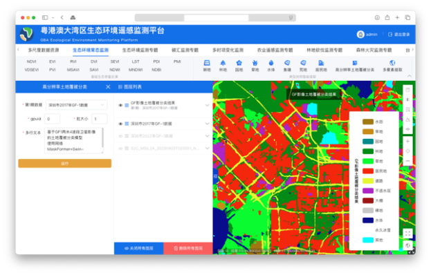 该平台系统由“国家重点研发计划”、“深圳市可持续开展专项”等项目支持搭建,利用分布式存储、云服务检索及在线可视化等技术,集多源数据在线调取、多模型算法实时计算、在线可视化统计分析等功能于一体,能够实现实时卫星数据接入、遥感生态参量在线计算、地表要素人工智能在线提取、区域变化在线分析、生态风险动态评估、灾害信息动态查看以及生态红线内要素动态监测预警等多类别业务应用。研究成果将服务于粤港澳大湾区国土资源变化智能监测及生态环境质量诊断评估,助力于有助于粤港澳大湾区“天-空-地一体化”遥感生态环境监测系统技术体系开展,能够为粤港澳大湾区生态文明建设给予强有力的科技支撑。
